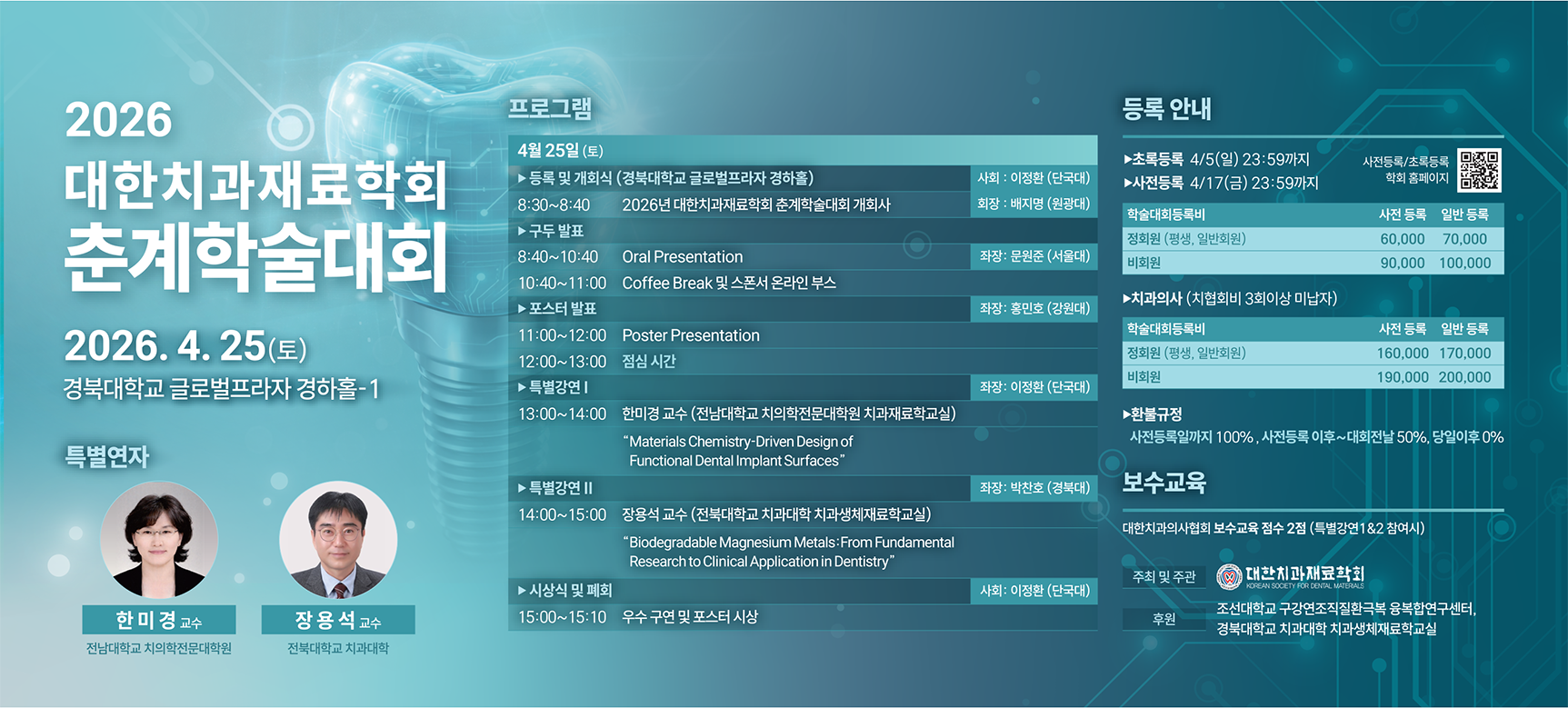 2026년 대한치과재료학회 춘계학술대회가 2026년 4월 25일 (토)